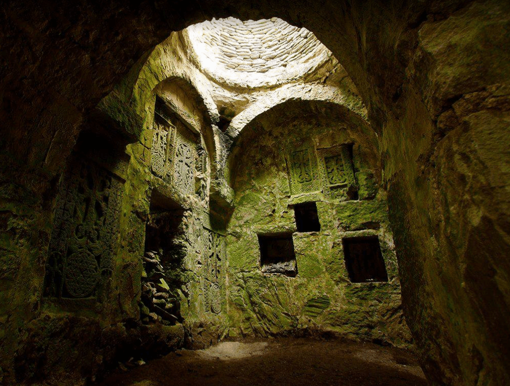 After almost an hour of walking, we came to a small sign that gave some background information about Matosavank. The thirteenth century monastery was built in the year 1251 by Avag and Ivane Zakarian of the Orbelian Dynasty. My breath was ripped away from me as the church came into view. As we filed in single file through the one entrance, our eyes were blinded by the beauty. The church consists of three rooms, the porch, the church, and the book depository. One of the walls was built entirely of Khatchkars, or crosstones. Two small holes in the ceiling lit up the church, illuminating the space around us. Part of the wall was cracked, letting plants grow inside.